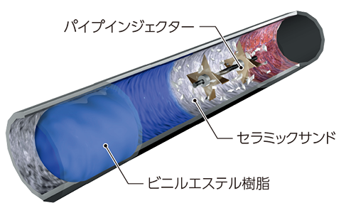 マンション等、集合住宅の給排水設備に用いられる設備配管類は、使用していく上で老朽化は避けられません。特に炭素鋼管を母材とした配管は腐食等による老朽化が進み、漏水が起こるなどの現象が見られます。管更生は、管内面に気流やピグ(ポール)を使い、防錆用樹脂のライニング塗膜を形成して給排水管、雨水管、空調管等の設備配管の寿命を延長する技術です。