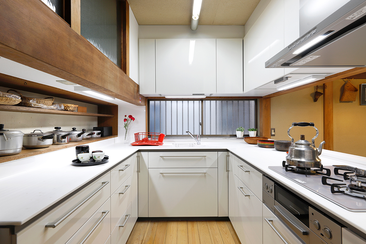 使い慣れたコの字型キッチンを、洗練されたホワイト基調の大容量収納キッチンへ